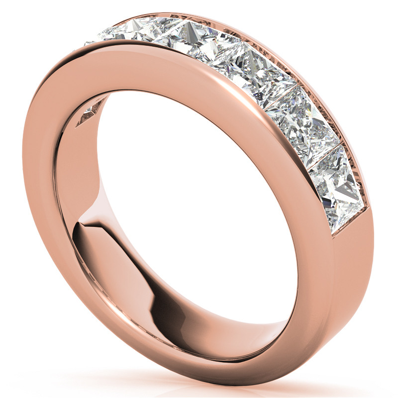 This beautiful channel set lab grown diamond anniversary ring features seven 4mm (0.43ct each) princess cut lab grown diamond stones for a total of 3.0 carat, set in 14k gold, 18k gold or platinum.