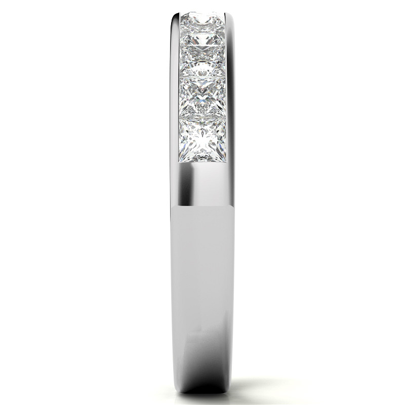 This beautiful channel set lab grown diamond anniversary ring features eleven 2.5mm (0.13ct each) princess cut lab grown diamond stones for a total of 1.4 carat, set in 14k gold, 18k gold or platinum.