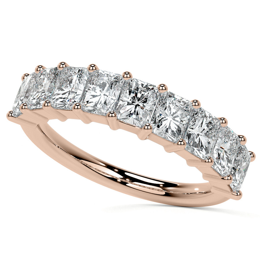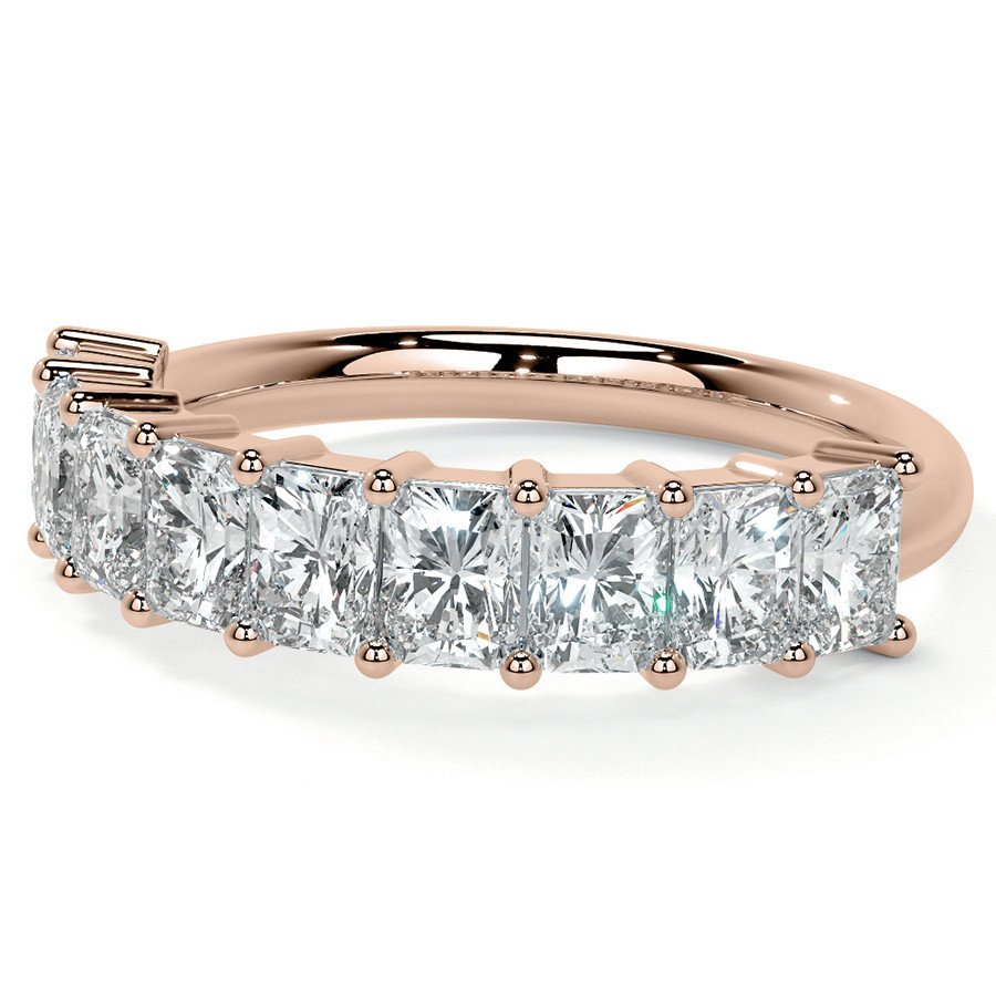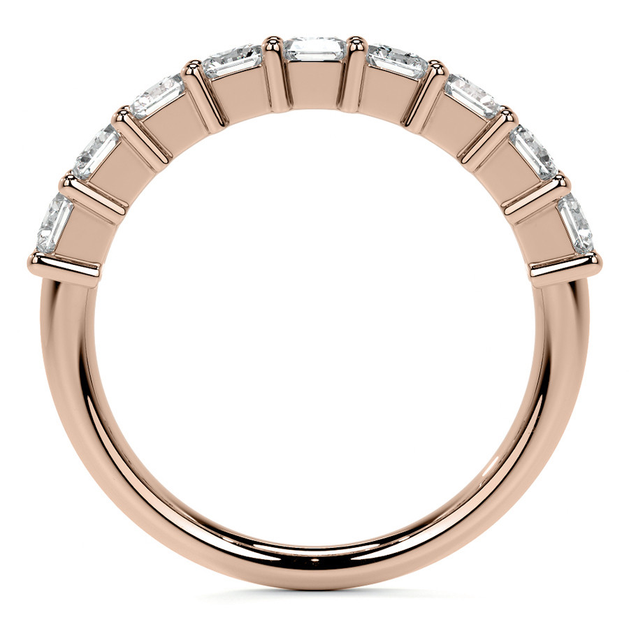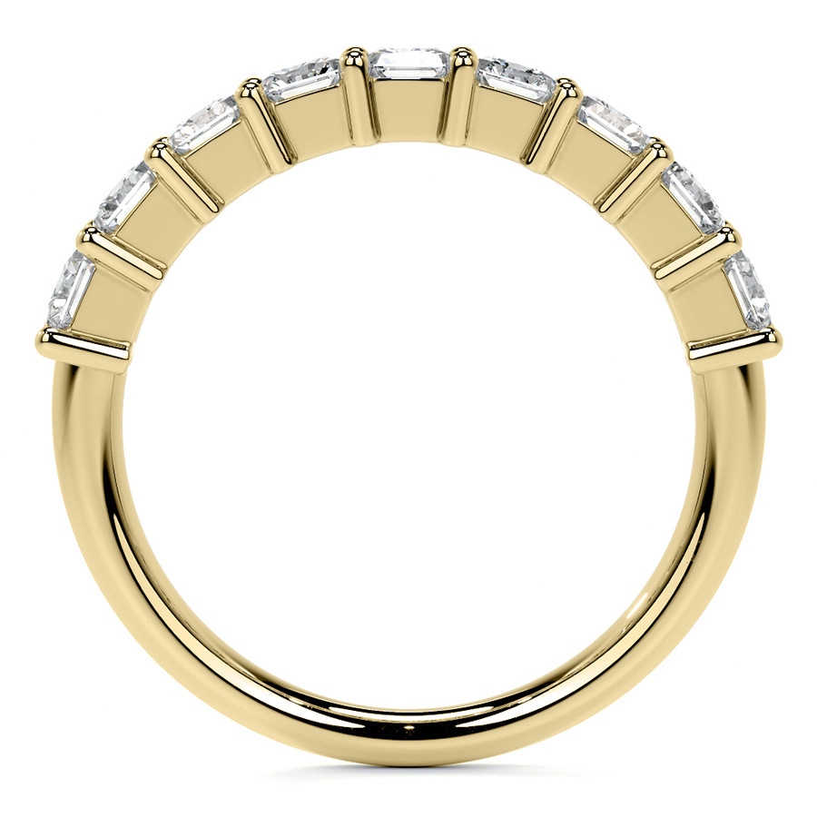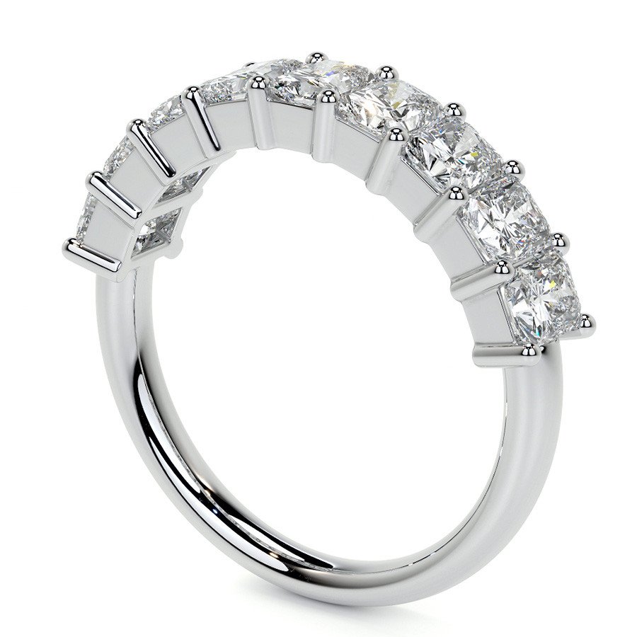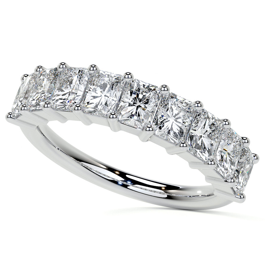 This beautiful lab grown diamond anniversary band features 1.8ct of 4x3mm/0.20ct emerald or radiant cut lab grown diamond gemstones, cast in your choice of 14k gold, 18k gold or platinum. The band width is approximately 2mm at the base of the ring and 4mm at its widest point.