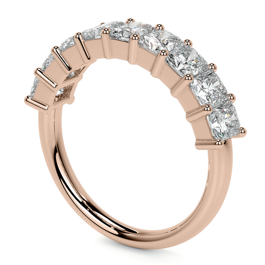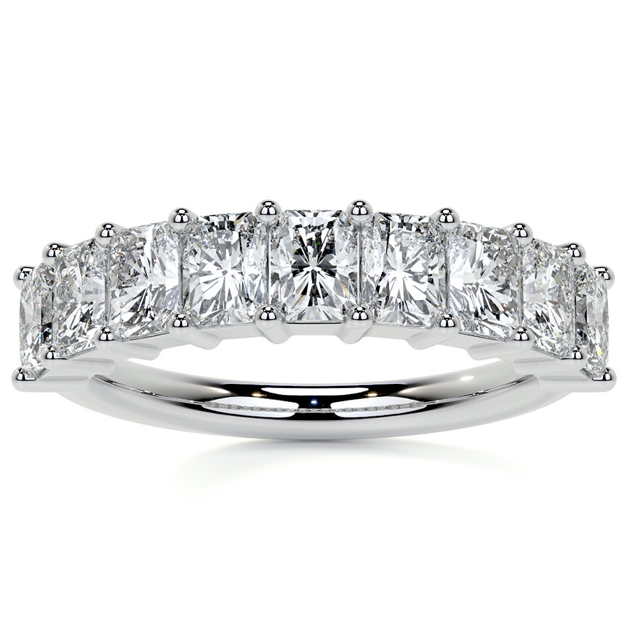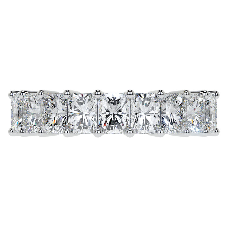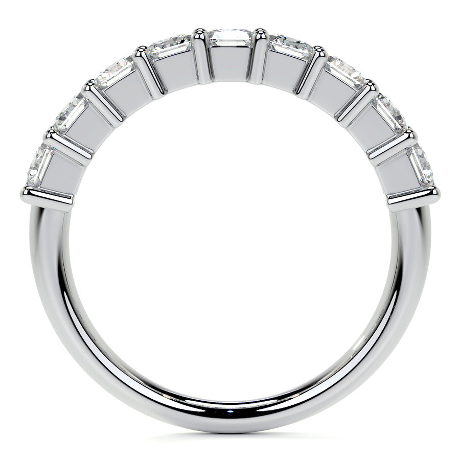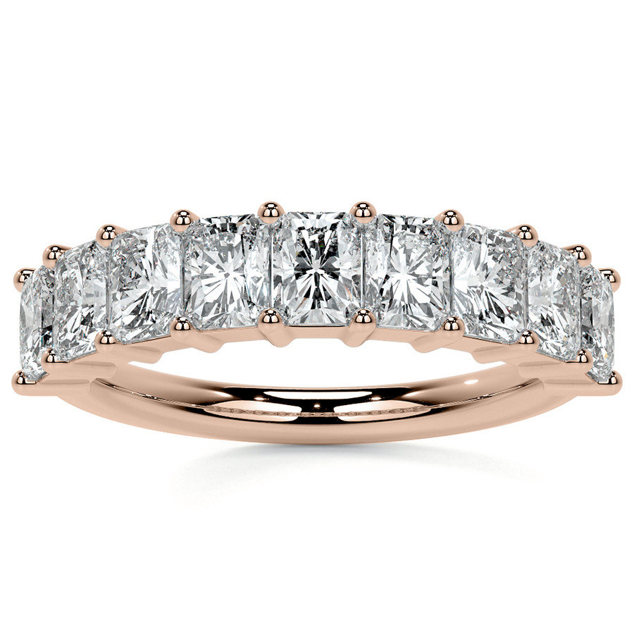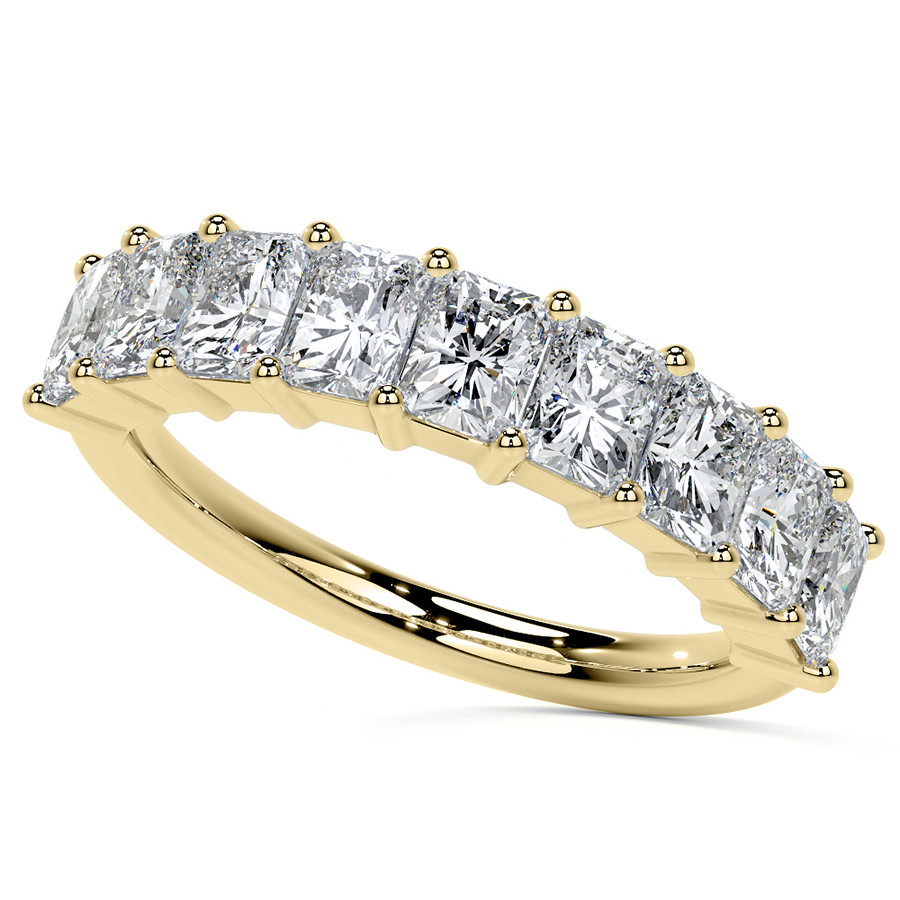This beautiful lab grown diamond anniversary band features 1.8ct of 4x3mm/0.20ct emerald or radiant cut lab grown diamond gemstones, cast in your choice of 14k gold, 18k gold or platinum. The band width is approximately 2mm at the base of the ring and 4mm at its widest point.