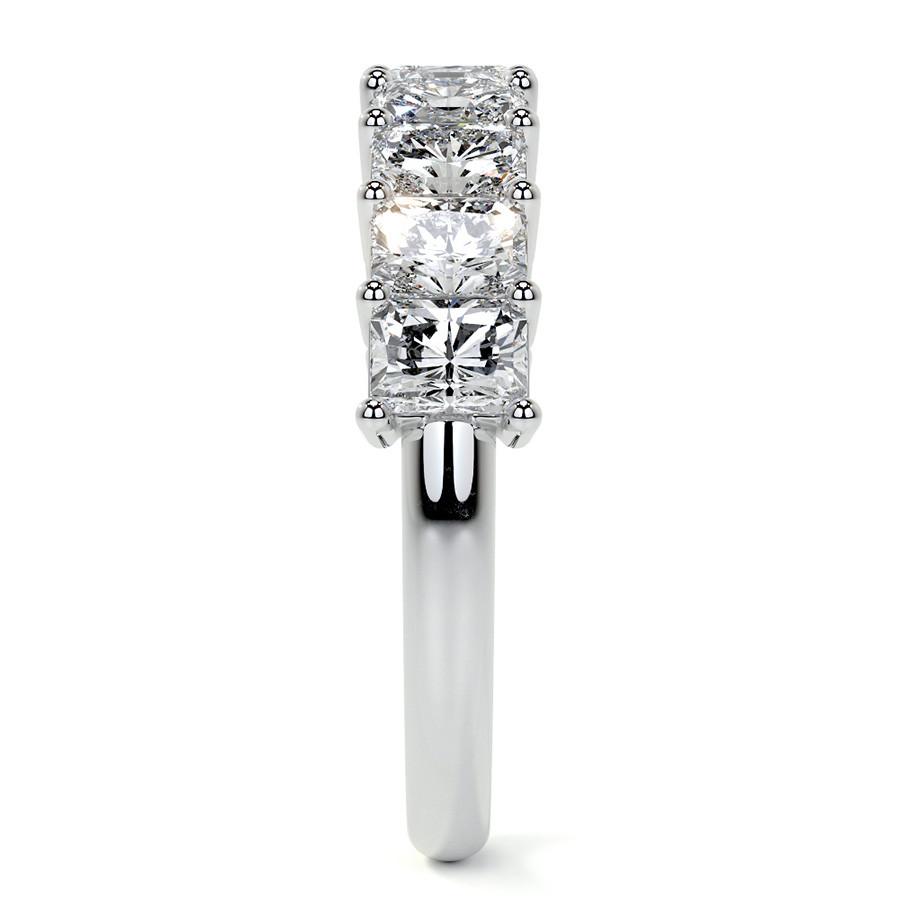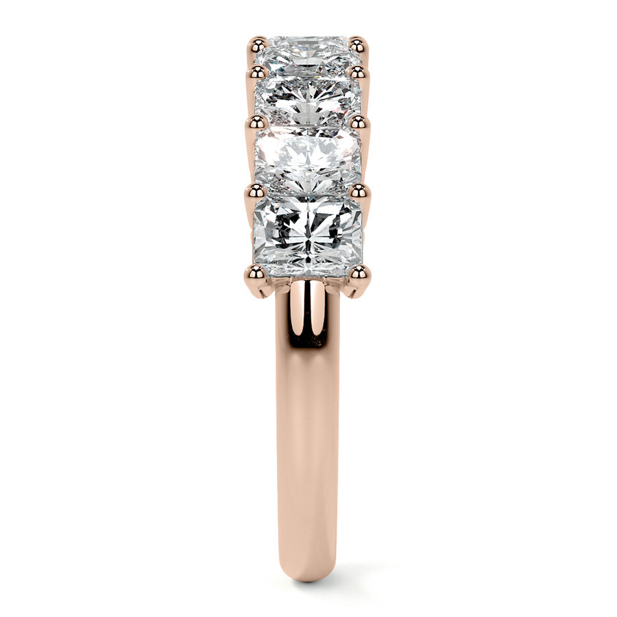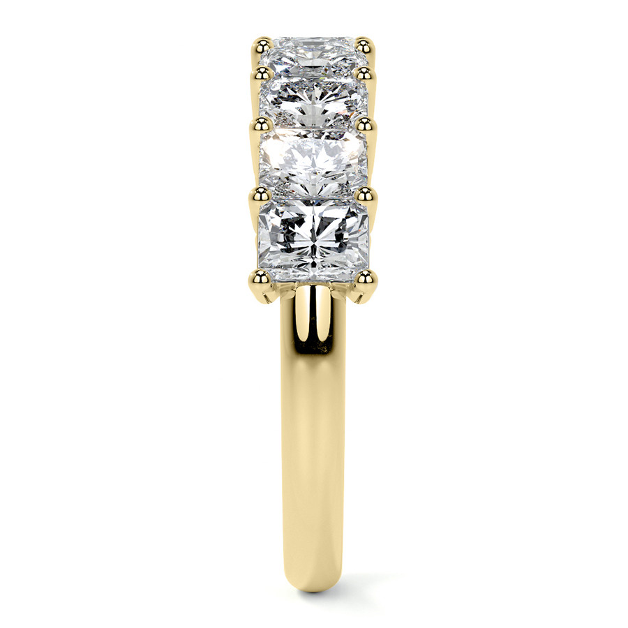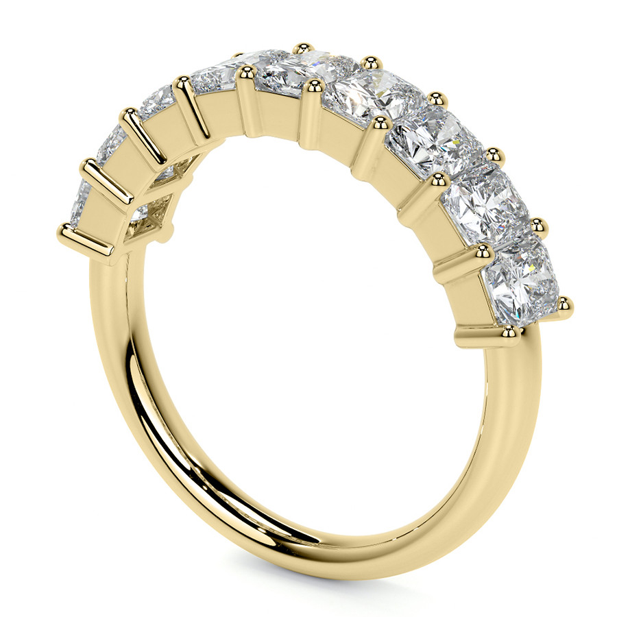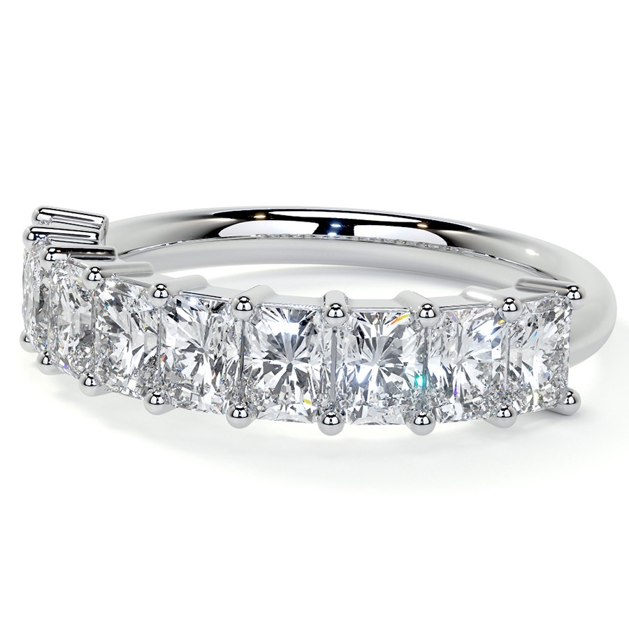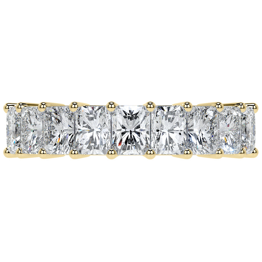 This beautiful lab grown diamond anniversary band features 1.8ct of 4x3mm/0.20ct emerald or radiant cut lab grown diamond gemstones, cast in your choice of 14k gold, 18k gold or platinum. The band width is approximately 2mm at the base of the ring and 4mm at its widest point.