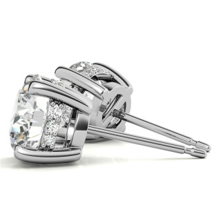 These beautiful Forever One H&A lab grown diamond stud earrings feature a classic 4 prong basket design with Forever One round brilliant Hearts & Arrows lab grown diamonds and diamond accents on the basket.