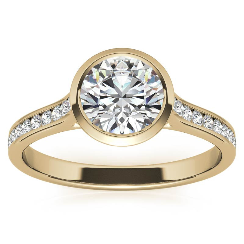 This beautiful lab grown diamond engagement ring features a petite bezel design with a round brilliant lab grown diamond center stone, 0.18ct tw of round brilliant lab grown diamond side stones, channel set in 14k gold, 18k gold or platinum. The band measures approximately 2mm in width.