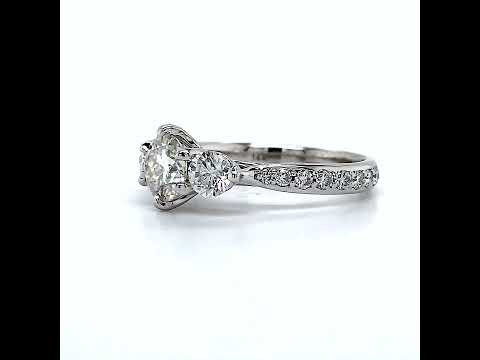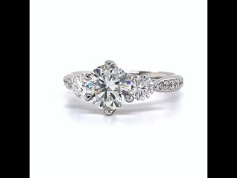 This beautiful lab grown diamond engagement ring features a 6 prong trellis 3-stone design with a round brilliant lab grown diamond center stone, two 0.25ct round brilliant lab grown diamond side stones, and 0.28ct of smaller round brilliant lab grown diamond side stones (0.78ct tw), set in 14k gold, 18k gold or platinum. Shown with a 1.25ct center stone.