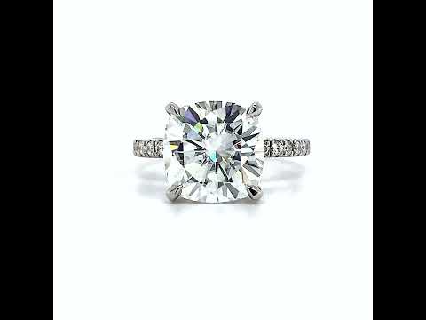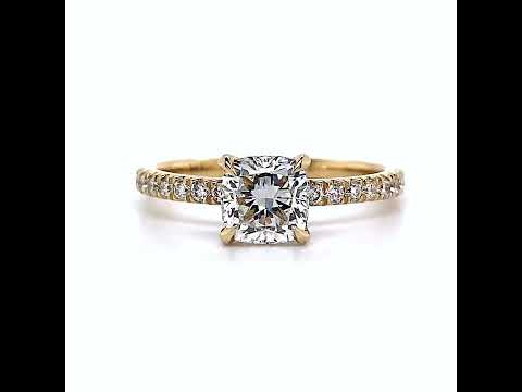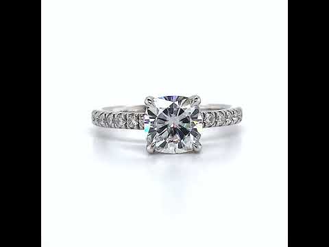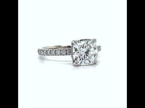 This exquisite piece features a dazzling cushion cut lab grown diamond at the center, surrounded by a mesmerizing hidden halo of sparkling stones. The side stones are strategically set around the center stone, down the prongs, and down the band, creating a seamless and cohesive design.