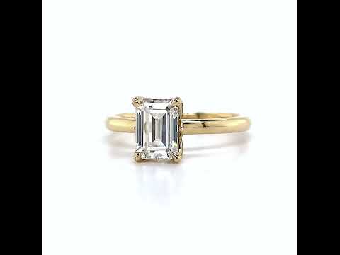 This captivating cathedral-style engagement ring is an exquisite piece of art, meticulously crafted to showcase a stunning round brilliant lab grown diamond center stone, securely held in place by six meticulously-crafted tulip-shaped prongs.