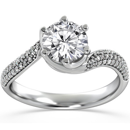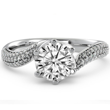 This lab grown diamond engagement ring features a 6-prong bypass style design, a round brilliant lab grown diamond center stone, 1/5ct of round brilliant diamond side stones, micro-prong set in 14k gold, 18k gold or platinum.