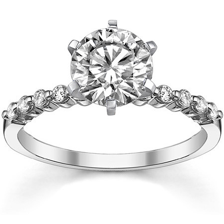 This beautiful lab grown diamond engagement ring features a shared prong design with 0.20cts of round brilliant lab grown diamond side stones, set in 14k gold, 18k gold or platinum, with your choice of colorless lab grown diamond center stone.