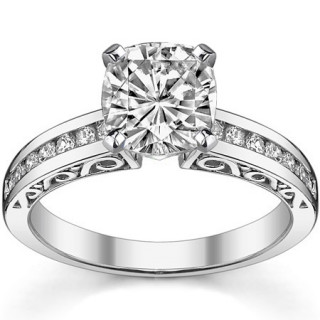 This beautiful lab grown diamond engagement ring features a scroll design gallery with 0.28 carat of round brilliant lab grown diamond side stones channel set in 14k gold, 18k gold or platinum.