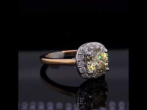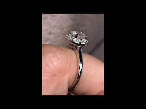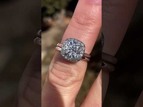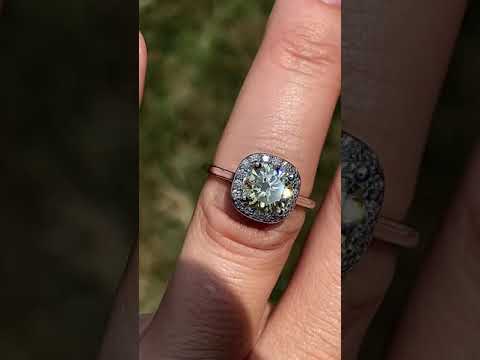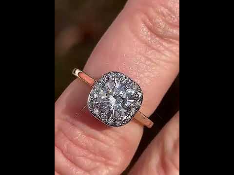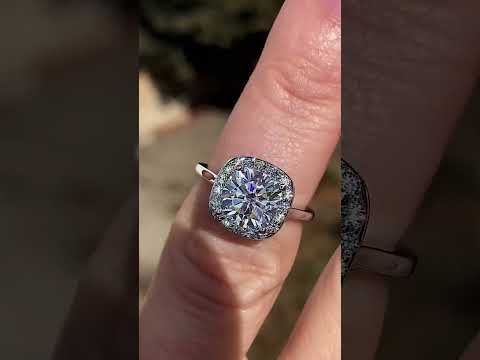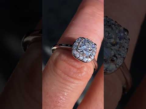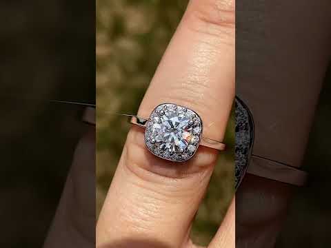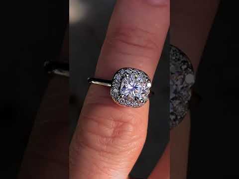 This unique engagement ring features a beautiful halo design, a cushion cut lab grown diamond center stone, and up to .30ct of round brilliant lab grown diamond side stones, cast in a 14k gold, 18k gold or platinum mounting.