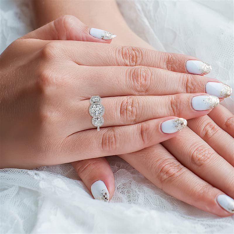 This beautiful engagement ring features a petite 3-stone halo design, three round brilliant lab grown diamond center stones surrounded by 1/3ct of round brilliant lab grown diamond stones, set in 14k white gold. The main image is shown with a 1.5ct center stone and two 4.5mm (0.33ct each) side stones. If the 2ct center stone is chosen, the two side stones are 5mm (0.50ct each). If a 1.0ct or 1.25ct center stone is selected, each side stones is 4.0mm (0.25ct each).