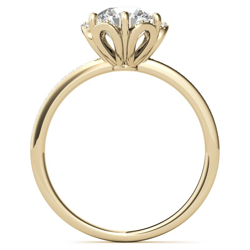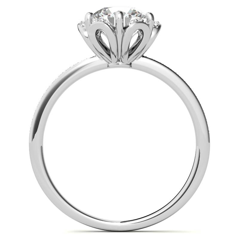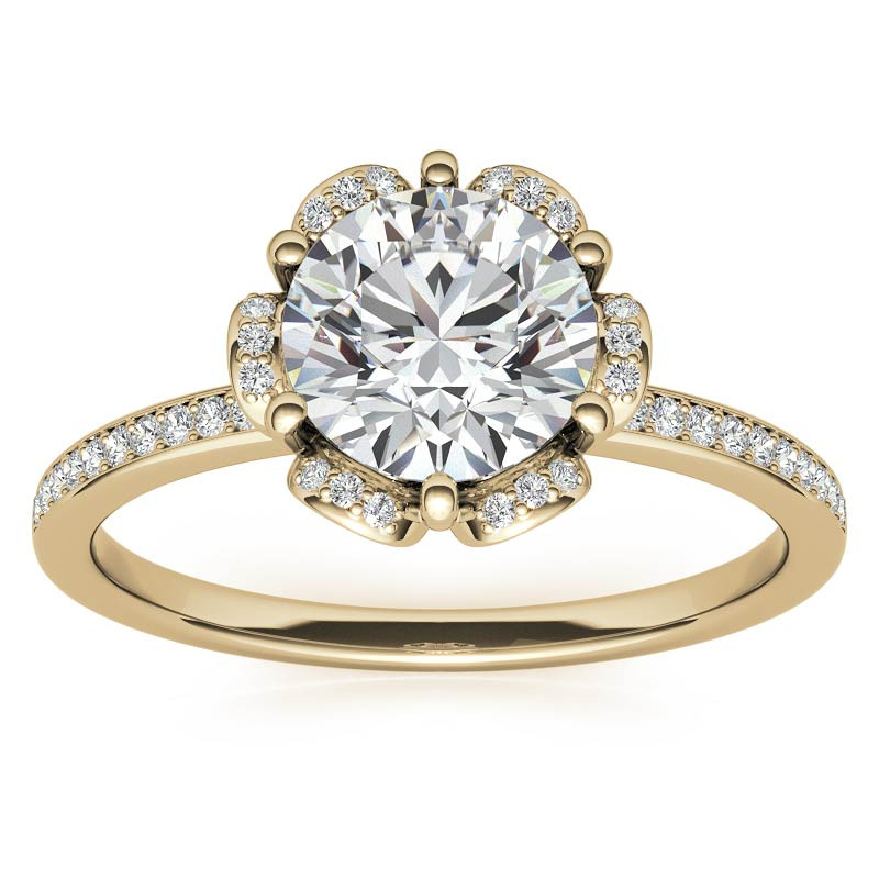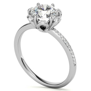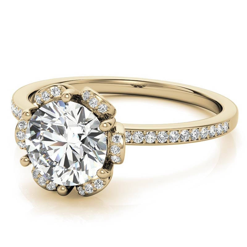 This beautiful lab grown diamond engagement ring features a petite floral style design with a round brilliant lab grown diamond center stone, 1/5ct of round brilliant lab grown diamond side stones set in 14k gold, 18k gold or platinum.