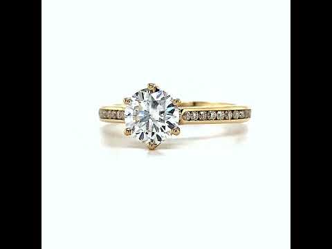 This beautiful lab grown diamond engagement ring features a 6-prong trellis style design, 1/4ct of round brilliant lab grown diamond side stones, a round brilliant lab grown diamond center stone, and is set in your choice of 14k gold, 18k gold or platinum.