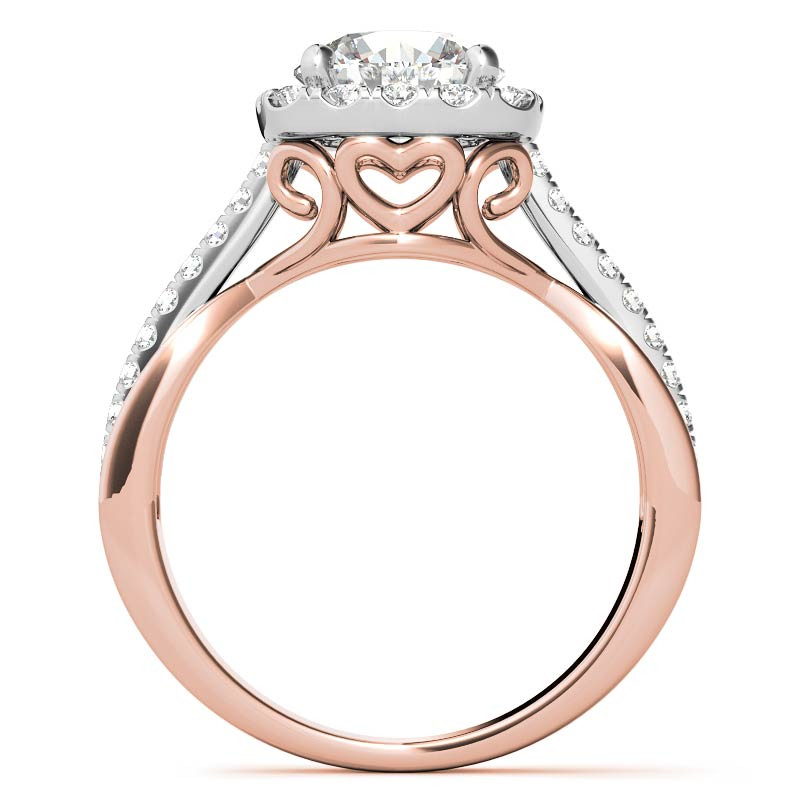 This beautiful lab grown diamond engagement ring features a cathedral design with heart accents. Surrounded by 0.31cts of round brilliant lab grown diamond side stones, it features a round brilliant cut colorless lab grown diamond center stone in 14k gold, 18k gold or platinum.