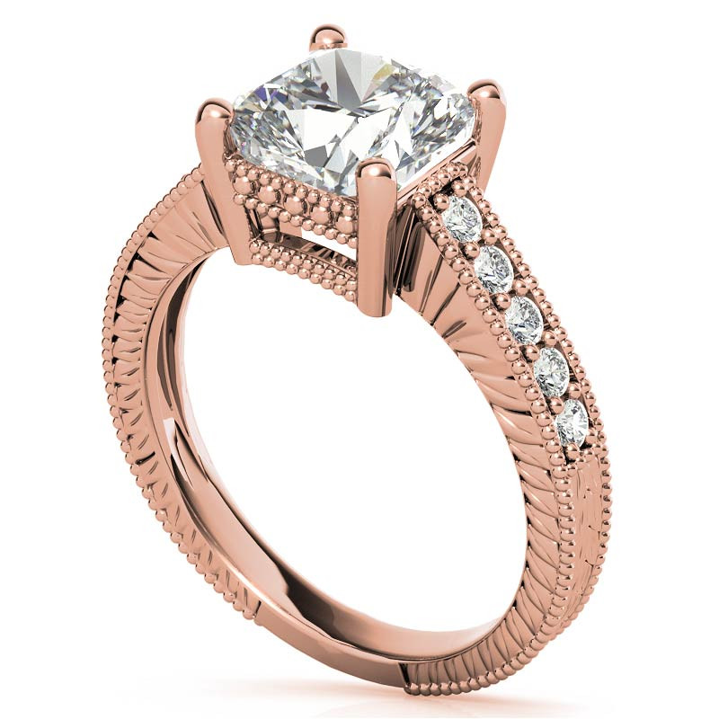This beautiful antique lab grown diamond ring features a cushion cut lab grown diamond center with 0.20 carat of round brilliant lab grown diamond side stones, set in 14k gold, 18k gold or platinum.