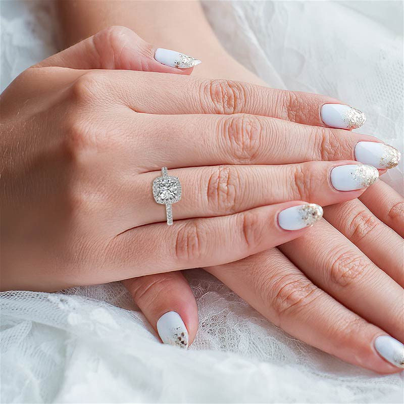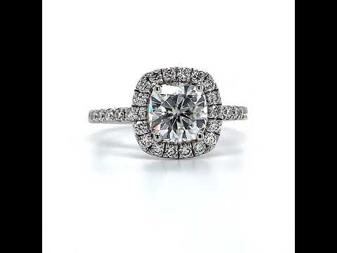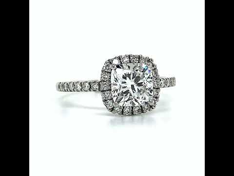 Featuring a classic halo design, this ring is crafted with a cushion cut lab grown diamond center stone, and 0.45ct - 0.50ct of round brilliant lab grown diamond side stones, each measuring 1.5mm. The result is a mesmerizing display of sparkle and brilliance that will take your breath away.