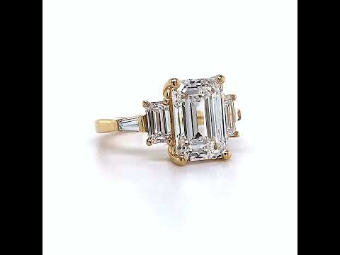 Featuring a classic halo design, this ring is crafted with your choice of an emerald or radiant cut lab grown diamond center stone, and 0.45ct - 0.50ct of round brilliant lab grown diamond side stones, each measuring 1.5mm. The result is a mesmerizing display of sparkle and brilliance that will take your breath away.