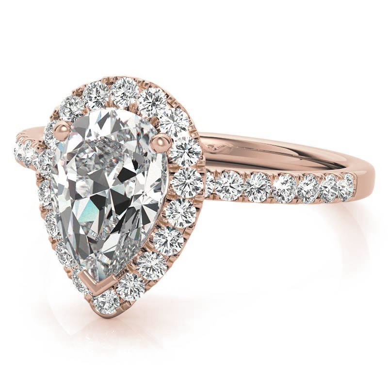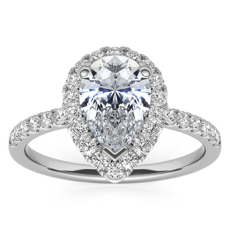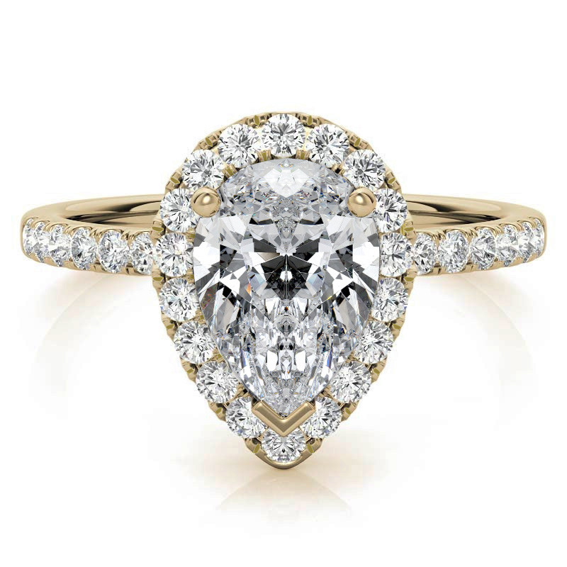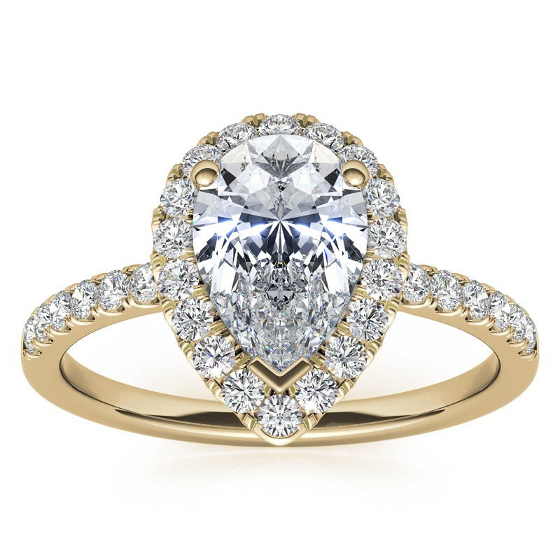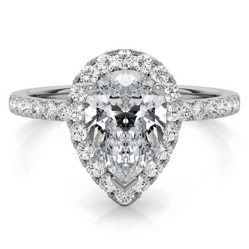 Featuring a classic halo design, this ring is crafted with a pear cut lab grown diamond center stone, and 0.45ct - 0.50ct of round brilliant lab grown diamond side stones, each measuring 1.5mm. The result is a mesmerizing display of sparkle and brilliance that will take your breath away.