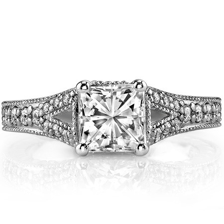 This beautiful antique style lab grown diamond split-shank ring features a princess cut lab grown diamond center stone, round brilliant lab grown diamond side stones, and is set in 14k gold, 18k gold or platinum.