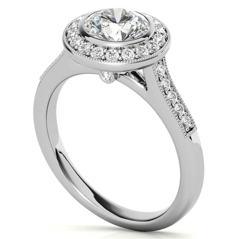 This beautiful Legacy style lab grown diamond halo ring features a bezel set round brilliant lab grown diamond center stone and 0.35ct - 0.40ct of round brilliant lab grown diamond side stones pave set in a substantial 14k gold, 18k gold or platinum setting.