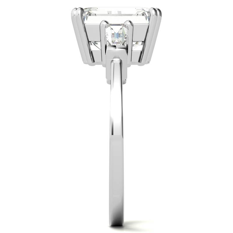This captivating piece is adorned with two tapered baguette lab grown diamond side stones, measuring 5x2.5x2mm and totaling 0.32ct, elegantly complementing a stunning emerald cut or radiant cut lab grown diamond center stone. The basket settings securely holds all stones in place, showcasing their dazzling shine from every angle.