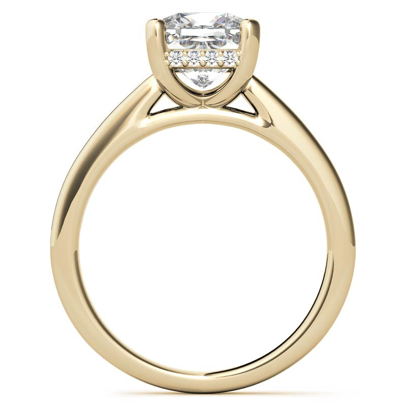 This beautiful lab grown diamond ring features a ring of pave lab grown diamond stones encircling the base of the center stone, a cushion lab grown diamond center stone with round diamond side stones, set in 14k gold, 18k gold or platinum.