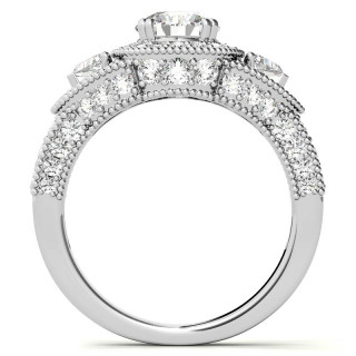 This beautiful lab grown diamond engagement ring features an antique style 3-stone halo design with milgrain accents, a round brilliant lab grown diamond center stone, two 3mm triangle lab grown diamond side stones, and round brilliant lab grown diamond side stones (0.8ct - 1.0ct), set in 14k white gold, 14k yellow gold, or platinum.