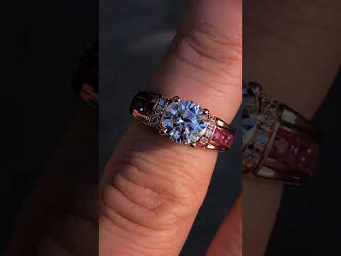 This beautiful lab grown diamond engagement ring features a round brilliant lab grown diamond center stone, 0.72 carat of cultured blue sapphire / ruby side stones, 0.46 carat of round brilliant lab grown diamond side stones, and is set in 14k white gold, 14k yellow gold, or platinum.