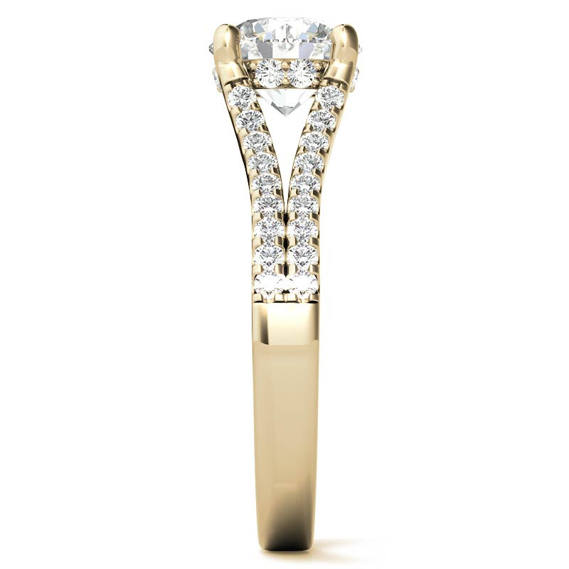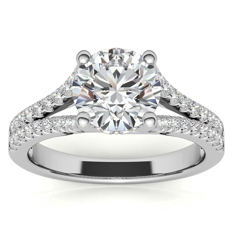 This beautiful lab grown diamond engagement ring features a split shank design with trellis style prongs, a round brilliant lab grown diamond center stone, and round brilliant lab grown diamond side stones (0.48ct - 0.42ct), set in 14k gold, 18k gold or platinum.