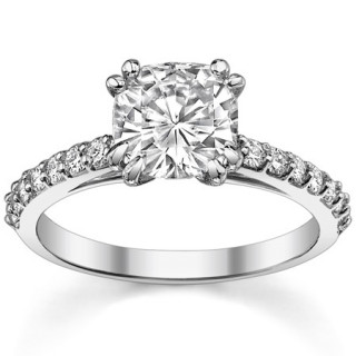 This beautiful lab grown diamond ring features a double prong, cathedral design, a cushion cut lab grown diamond center stone, 0.32 carat of round brilliant lab grown diamond side stones, set in 14k white gold, 14k yellow gold with white gold prongs, or platinum. The band measures approximately 2mm in width.