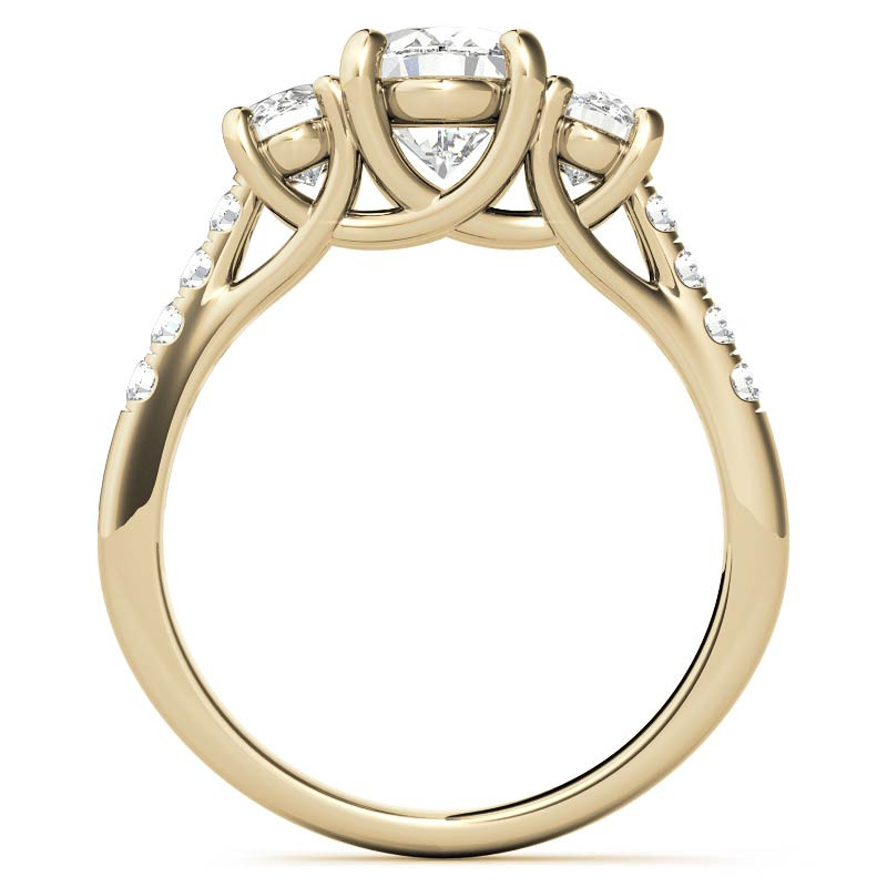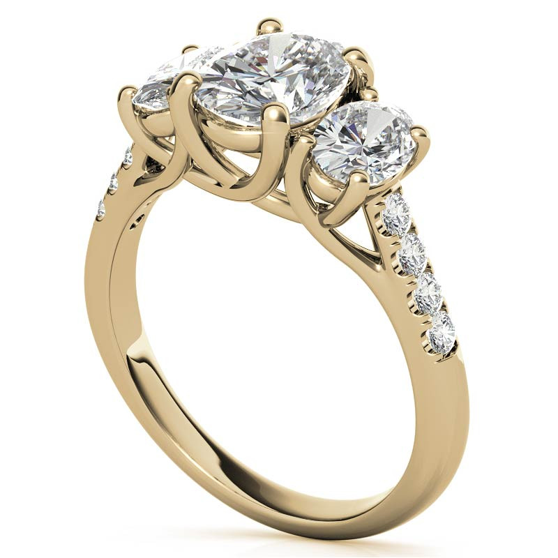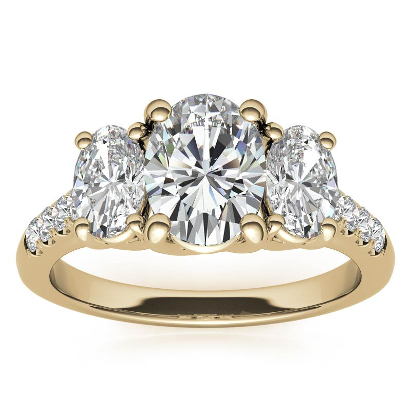 Thank you for considering our exquisite 3-stone cathedral engagement ring. Our trellis design creates a stunning showcase for the three main stones, which are oval cut lab grown diamonds gemstones.