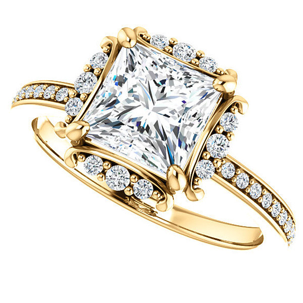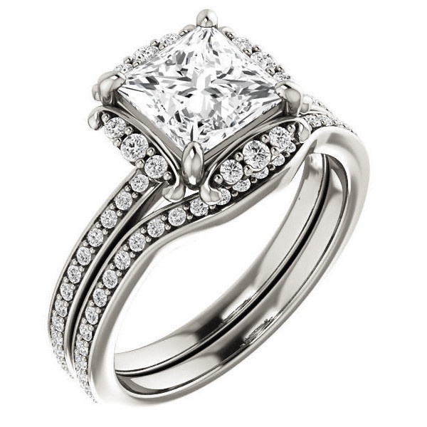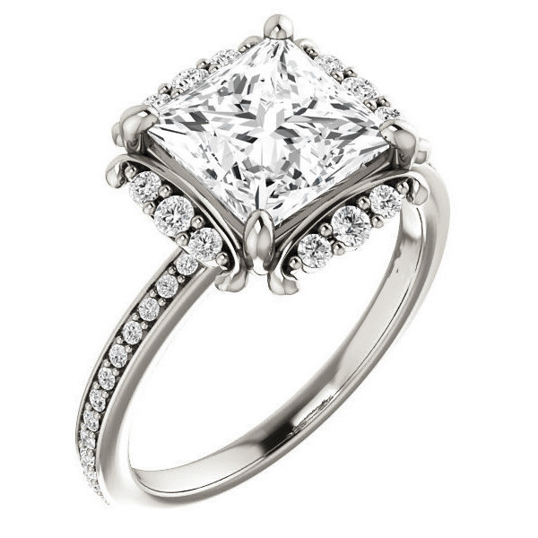 This beautiful lab grown diamond engagement ring features a princess cut colorless lab grown diamond center stone, 0.33ct of round VS, E/F quality diamond side stones cast in 14k gold, 18k gold or platinum. Add the optional matching band which has 0.16ct of additional diamonds and make it a wedding set.