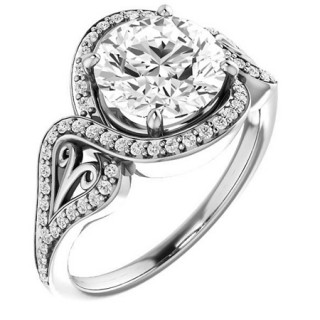This beautiful lab grown diamond engagement ring features a split shank halo design with scroll accents, a round brilliant lab grown diamond center stone, 0.26ct of round brilliant diamond side stones cast in 14k gold, 18k gold or platinum. Add the optional matching band which has 0.12ct of round brilliant diamond side stones and make it a wedding set.