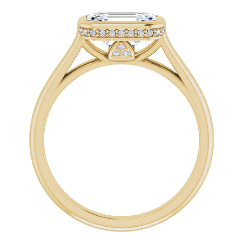This beautiful engagement ring features a bezel style design with your choice of emerald or radiant cut colorless lab grown diamond center stone, round brilliant diamond side stones (0.06ct - 0.17ct), cast in 14k gold.