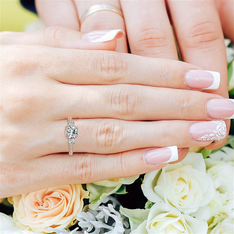 This beautiful lab grown diamond engagement ring features a 3-stone design with a round brilliant lab grown diamond center stone, 0.65ct of round brilliant lab grown diamond side stones cast in 14k gold, 18k gold or platinum. Add the optional matching band which has 0.25ct of round brilliant lab grown diamonds and make it a wedding set.