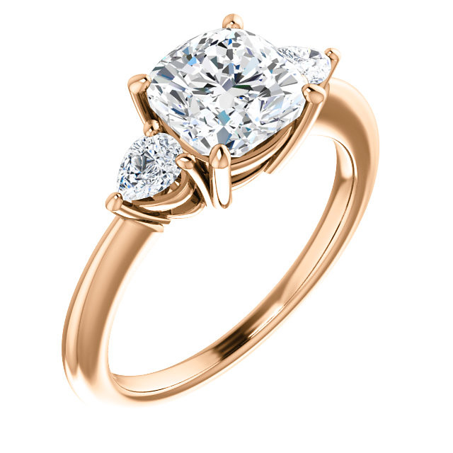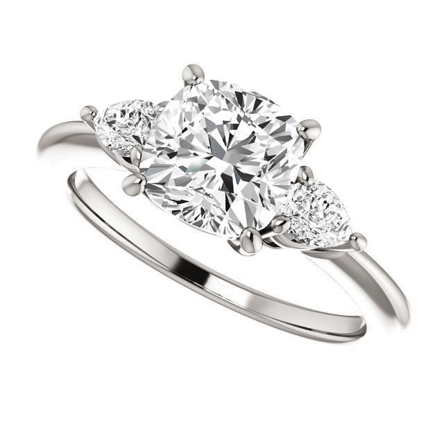 This exquisite engagement ring boasts a captivating three-stone design, featuring three basket set lab grown diamond stones. The center stone, a cushion cut lab grown diamond, can be customized to any desired size and is beautifully complemented by two 4x2mm/0.12ct pears.