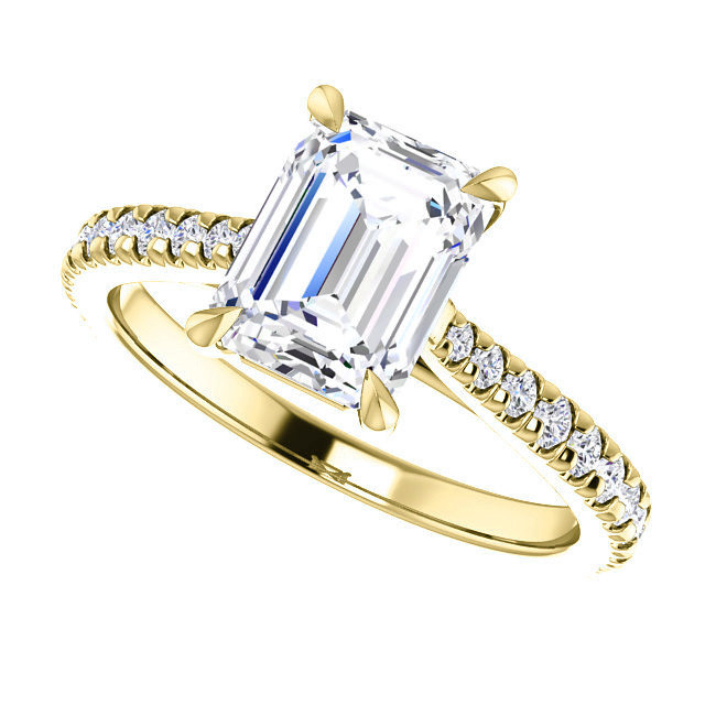 The centerpiece is an emerald or radiant cut lab grown diamond stone that is secured by six elegant claw-shaped prongs, while the 2.1mm band width gracefully tapers up towards the center stone.