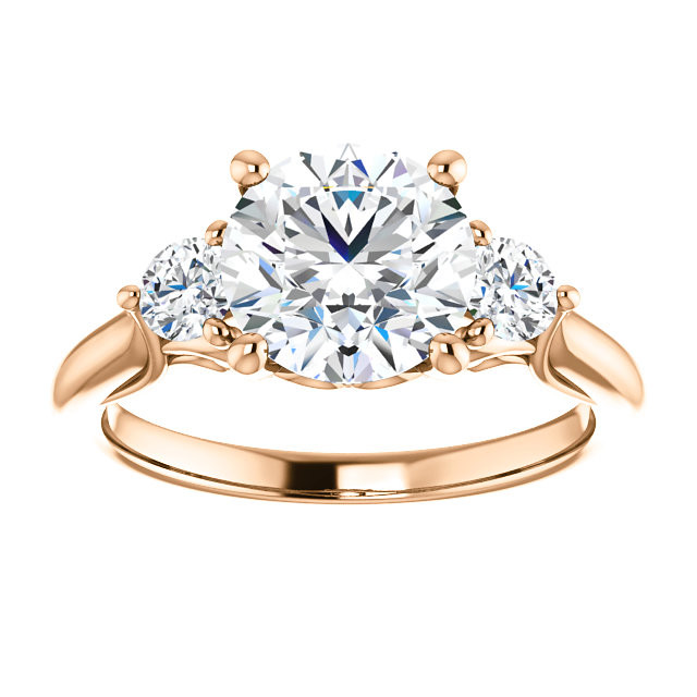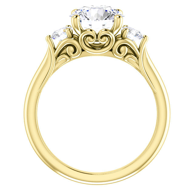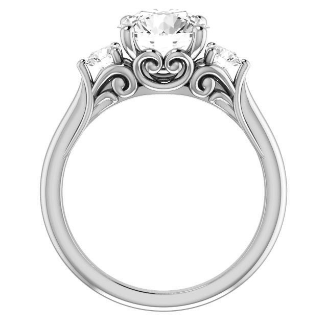This 3-stone ring features scroll work under the round brilliant cut colorless lab grown diamond center stone with two round brilliant colorless lab grown diamond side stones, set in your choice of 14k gold, 18k gold or platinum. Add the optional matching band to make it a wedding set.