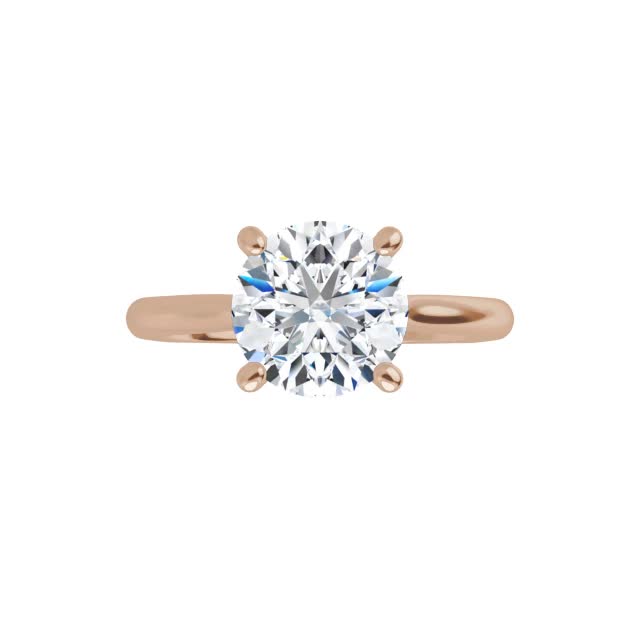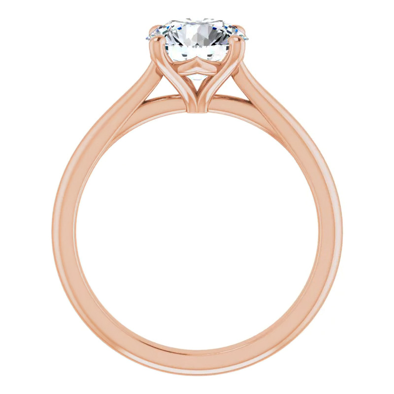 This solitaire ring features a cathedral design holding the Round brilliant cut lab grown diamond center stone, and is set in your choice of 14k gold, 18k gold or platinum. A matching band is available.