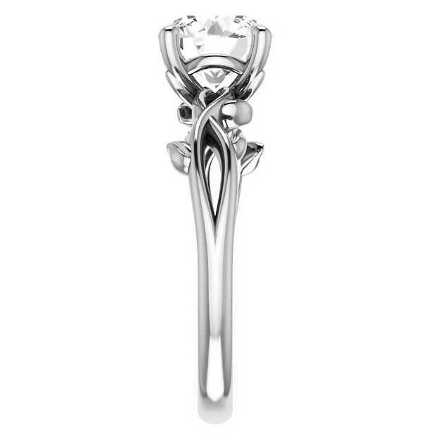 This solitaire ring features a floral design set with an oval cut lab grown diamond center stone and is set in your choice of 14k gold, 18k gold or platinum. A matching band is available.