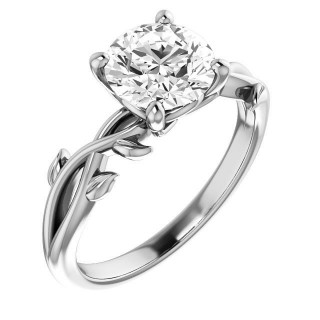 This solitaire ring features a floral design with leaf accents, a round brilliant cut colorless lab grown diamond center stone, and is set in your choice of 14k gold, 18k gold or platinum. A matching band is available.