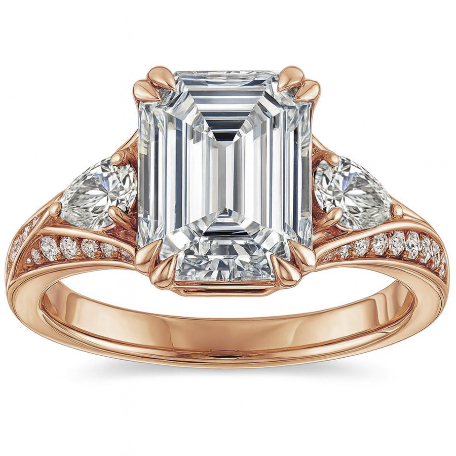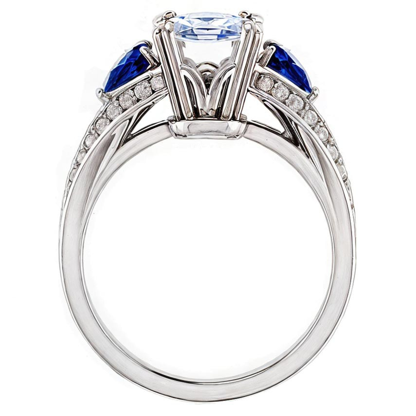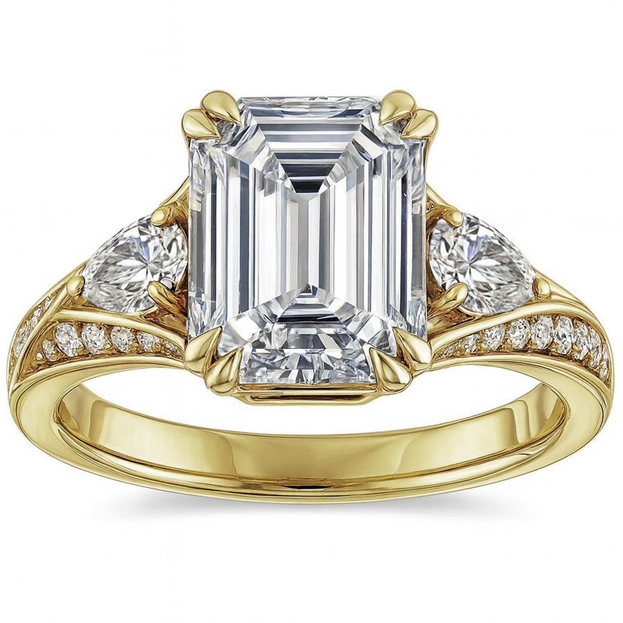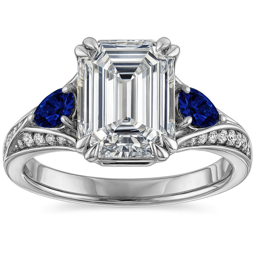 This beautiful engagement ring features your choice of an emerald or radiant cut colorless lab grown diamond center stone, 0.46ct - 0.47ct of round brilliant diamond side stones, two 5x3mm pear cut blue sapphire, ruby, or emerald side stones and is cast in 14k gold.