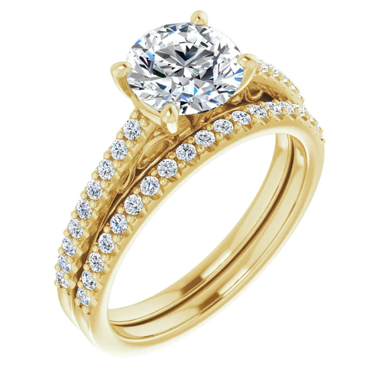 This beautiful engagement ring features a scroll design with a round brilliant cut lab grown diamond center stone, 0.18ct of round brilliant lab grown diamond side stones, and set in your choice of 14k gold, 18k gold or platinum. Choose the optional matching band to make it a complete set.