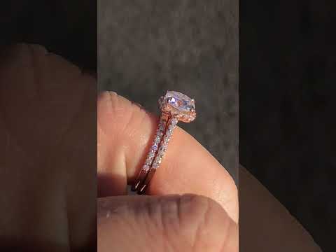 This petite engagement ring features a delicate scroll design with a cushion cut lab grown diamond center stone, 0.40ct of round brilliant lab grown diamond side stones, and is set in your choice of 14k gold, 18k gold or platinum. Add the optional matching band to complete the set.