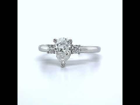 This beautiful three-stone engagement ring features a pear cut colorless lab grown diamond center stone and two round brilliant cut colorless lab grown diamond side stones, set in your choice of 14k gold, 18k gold or platinum.