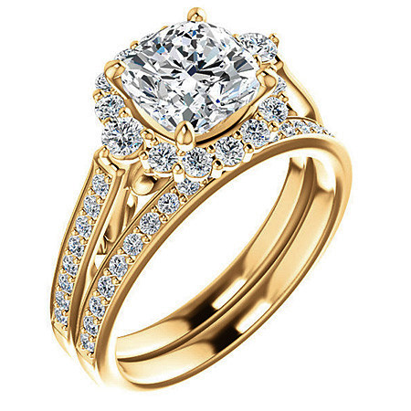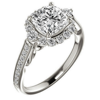 This stunning engagement ring features a halo design with scroll accents, a cushion cut lab grown diamond center stone, two smaller accenting lab grown diamond stones, and is set in your choice of 14k gold, 18k gold or platinum. The side stone carat weight ranges from 0.45ct - 0.85ct depending on the center stone size selected. Choose the optional matching band to make it a complete wedding set.
