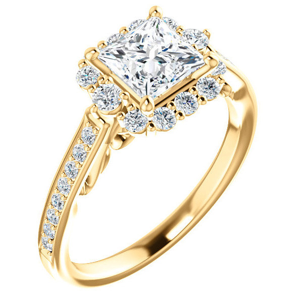 This stunning engagement ring features a halo design with scroll accents, a princess cut lab grown diamond center stone, two smaller accenting lab grown diamond stones, and is set in your choice of 14k gold, 18k gold or platinum. The side stone carat weight ranges from 0.45ct - 0.85ct depending on the center stone size selected. Choose the optional matching band to make it a complete wedding set.