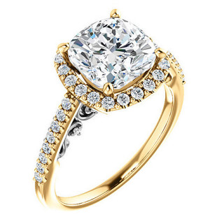 This stunning engagement ring features an ornate halo design with scroll accents, set with a cushion cut lab grown diamond center stone, 0.22ct of round brilliant lab grown diamond side stones, and is available in your choice of 14k gold, 18k gold or platinum. Add the optional matching band to make it a complete set.