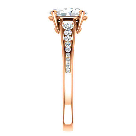 This beautiful engagement ring features an oval cut colorless lab grown diamond center stone and 0.24cts of channel-set VS, E/F quality diamond side stones, set in your choice of 14k gold, 18k gold or platinum. Add the optional matching band to complete this wedding set.