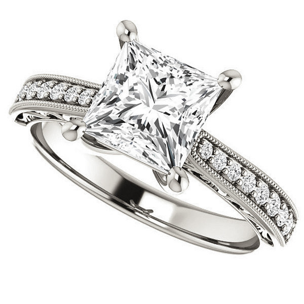 This beautiful engagement ring features a hand engraved design with milgrain, a princess cut colorless lab grown diamond center stone, and 0.16ct of diamond side stones, set in your choice of 14k gold, 18k gold or platinum. Add the optional matching band to make it a complete set.